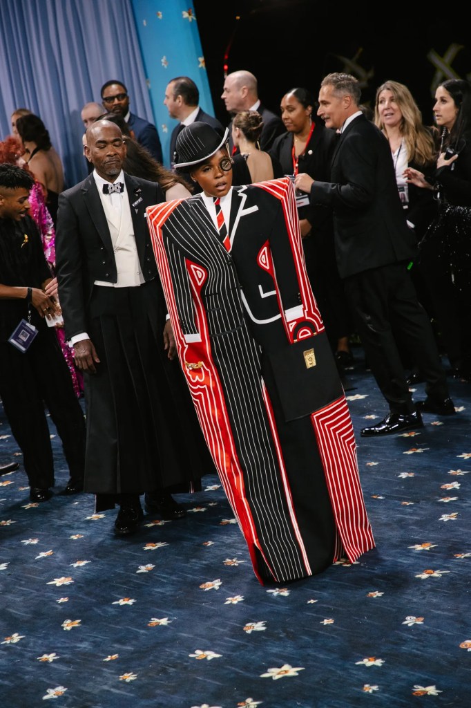 - Janelle Monáe: Known for her androgynous style, Monáe donned a striking outfit that combined sharp tailoring with bold accessories, embodying the spirit of the Black dandy. Created by Thom Browne, in collaboration with costume designer Paul Tazewell, celebrating the black dandy in a surrealist look styled by Alexandra Mandelkorn.